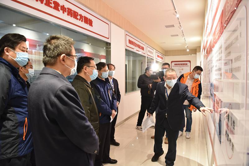 惠建林一行先后參觀了勁牌持正堂藥業國醫館、檢測實驗室、中藥提取一車間、中藥配方顆粒智慧藥房和中藥顆粒劑車間。參觀過程中,惠建林詳細詢問了用于新冠肺炎的中藥預防二號方、“清肺排毒湯”和“肺炎1號”治療方的生產情況,并對藥品配方、藥材檢測、生產設備、工藝流程等進行了深入了解。